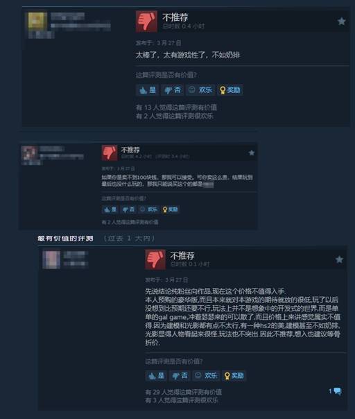 而给差评的玩家大多表示,本作的核心玩法“拍照”缺乏游戏性,并且298元的价格实在是太贵了,建议等打折再考虑购买。