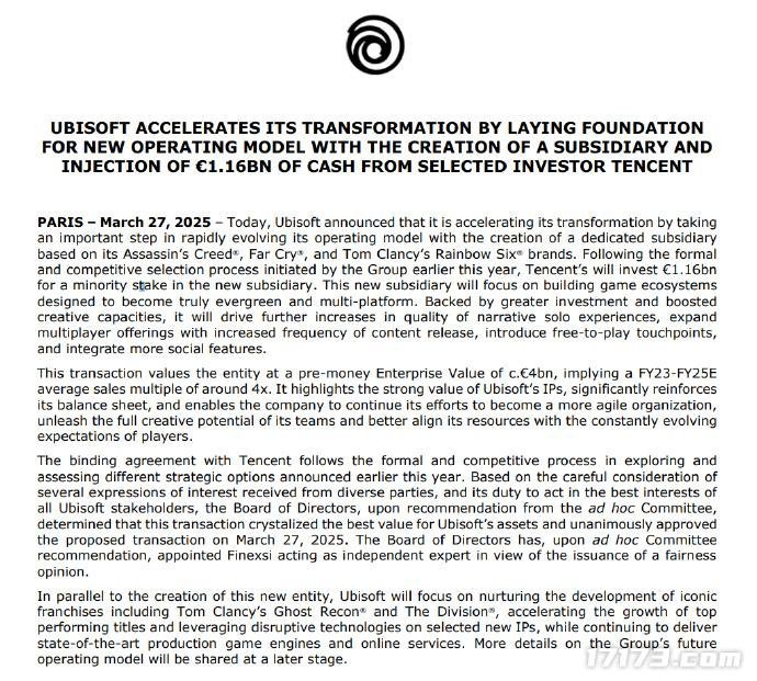 育碧联合创始人兼首席执行官 Yves Guillemot 在新闻稿中表示:“通过成立专门的子公司来带头开发我们最大的三个系列的游戏,并引入腾讯作为少数股东,我们正在实现资产价值的实现,加强我们的资产负债表,并为这些系列游戏的长期增长和成功创造最佳条件。”
