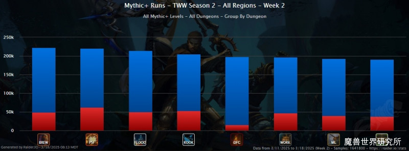 第二赛季钥石通关率下方Raider.IO图表显示了地心之战第二赛季史诗钥石轮换地下城的通关率。