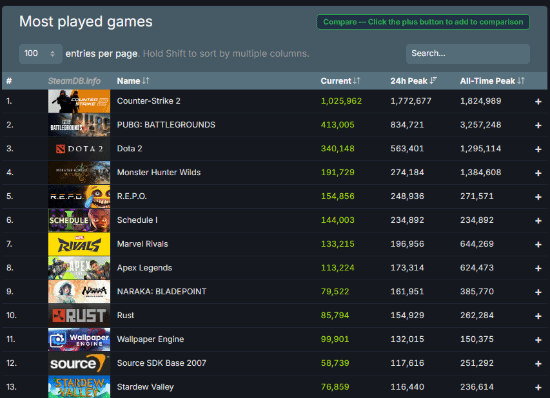 自3月25日正式上线以来,《Schedule 1》每日玩家峰值不断攀升。截至3月28日,游戏的同时在线玩家数突破23.4万,24小时内热度表现超越了《彩虹六号:围攻》《星际战甲》等知名大作,还一举进入Steam历史最高在线榜单的第63位。