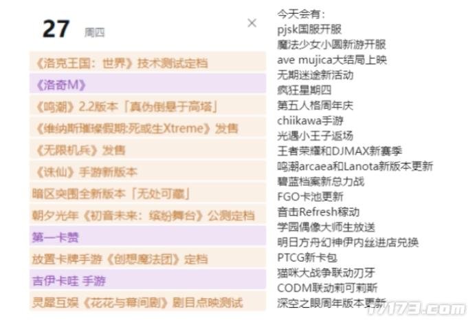 这一天《鸣潮》《诛仙》手游等诸多游戏推出新版本及活动,《无限机兵》《卡赞》《初音未来:缤纷舞台》《死或生》等诸多新游发售,还有《洛克王国:世界》等热点游戏开放测试,给兄弟们看一下老X的工作日历和二次元专属总结,这还只是冰山一角。这一天《鸣潮》《诛仙》手游等诸多游戏推出新版本及活动,《无限机兵》《卡赞》《初音未来:缤纷舞台》《死或生》等诸多新游发售,还有《洛克王国:世界》等热点游戏开放测试,给兄弟们看一下老X的工作日历和二次元专属总结,这还只是冰山一角。