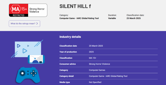 根据外媒playground的消息称,目前《寂静岭F》在澳大利亚的评级已出炉。出乎意料的是,这款恐怖游戏并未获得最高级别的评级,而是“MA 15 ”,仅面向15岁及以上的玩家。评级描述中只提到“极度恐怖”和“暴力”,没有给出其他原因。
