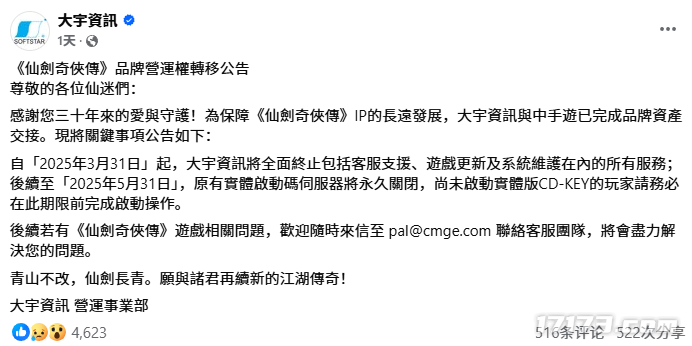 对于广大玩家来说,《仙剑奇侠传》不仅仅是一款游戏,它更是一段难以忘怀的记忆和情感寄托。大宇资讯在其公告中也表达了对三十年来一直支持并热爱着《仙剑奇侠传》系列玩家们的深深感激之情。同时,为了帮助玩家顺利过渡至新运营商提供的服务,大宇资讯还提供了中手游的客服邮箱地址——pal@cmge.com,供有需要的玩家联系咨询相关问题。