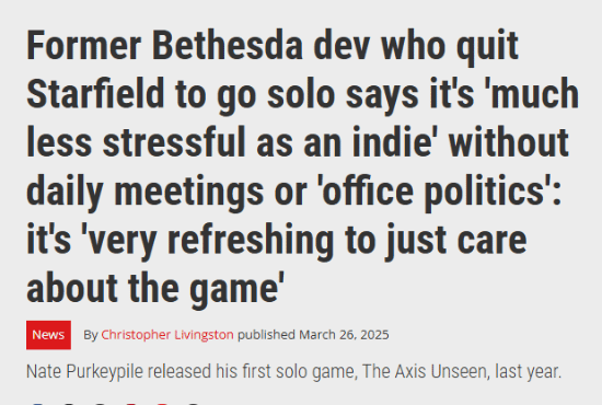 前贝塞斯达首席艺术家和世界艺术设计师Nate Purkeypile曾在公司任职14年之久,参与《上古卷轴5:天际》《辐射3》《辐射4》《辐射76》等热门游戏制作。然而,在开发《星空》期间,Nate Purkeypile选择离开了B社,创立了自己的独立游戏工作室。