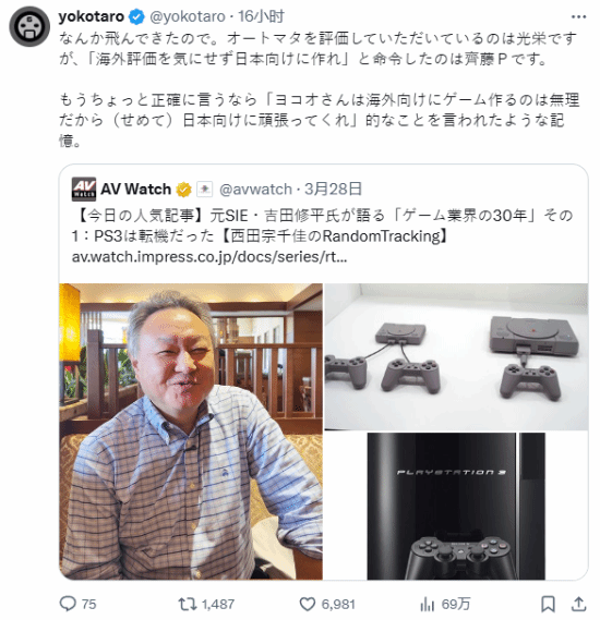 吉田修平盛赞《尼尔机械纪元》,称其为日本游戏产业在PS3时代盲目追随海外潮流受挫后实现复兴的关键作品。