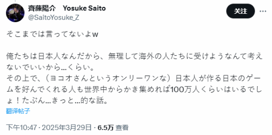 “我倒没说到那种程度啦(笑)。毕竟我们是日本人,不需要硬着头皮去迎合海外玩家的喜好……差不多就这意思。再说了,(横尾先生这种独一无二的)日本人做的日本游戏,只要把全世界喜欢这类作品的人凑一凑,应该能凑到100万玩家吧!大概…应该…之类的说法吧。”