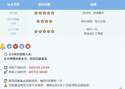 最后,本次更新调整的基金为居民招募基金,新版上线时间为:4月1日,旧版本基金购买不会继承,请务必在3月31日之前领取全部奖励哦。