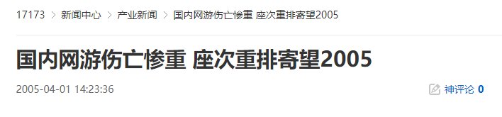 单纯的数据或许不够直观,那么,看看下面一组数据大概就更具说服力: 2004年5月1日**科技《使命》停止运营;2004年8月23日网易《精灵》宣布停止收费,2005年4月1日,网易《精灵》正式结束运营;2004年9月22日EA宣布《超越地球》停止运营;2004年11月9日大宇《深邃幻想》宣布停止运营;2004年12月31日金山华络《永恒》暂停运营(目前已由上海群皓接手运营);2005年1月5日上海育碧《无尽的任务》停止运营;3月25日,上海万马网络与其代理的网络游戏《RFonline》亦难逃厄运,而Tom在线则将放弃FPS网游《雷霆战队》。上面出现的大部分厂家名字都是响当当,以上仅是部分有名声的公司的停运,还有众多不为市场和玩家熟悉的网游厂商或运营商停运更是难以统计。 单纯的数据或许不够直观,那么,看看下面一组数据大概就更具说服力: 使命使命精灵精灵永恒永恒上面出现的大部分厂家名字都是响当当,以上仅是部分有名声的公司的停运,还有众多不为市场和玩家熟悉的网游厂商或运营商停运更是难以统计。