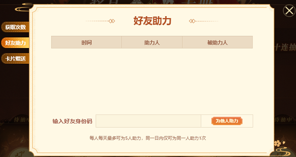 其中【好友助力】任务为:在好友助力弹窗中输入好友身份码,点击为他人助力,即可完成1次好友助力,活动期间每日为至少3位好友助力即可获得 3次 抽卡次数。与此同时,其他好友为你助力也可以获得对应助力次数,活动期间每日获得好友助力至少2次,将获得3次 抽卡次数。为方便大家查看活动任务完成情况,道友可以在好友助力界面查看自己为好友助力及好友为自己助力记录,包含时间、助力人和被助力人的角色名。(注:每人每天最多可为5人助力,同一日内仅可为同一人助力1次)【好友助力】1每日为至少3位好友助力3 33次 每日获得好友助力至少2次23次3 自己为好友助力及好友为自己助力记录51