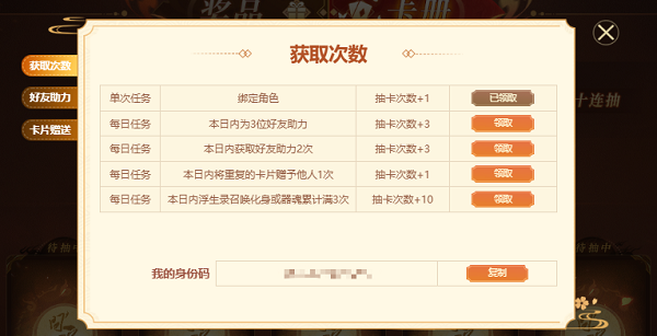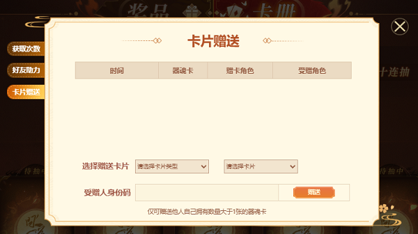 在抽卡过程中可以将自己多余的卡片赠给他人,在活动页面的卡片赠送弹窗中选中自己拥有数量>1的器魂卡,输入受赠人身份码后,点击赠送即可。活动期间每日将重复的卡片赠予他人至少1次,即可获得 1次 抽卡次数。卡片赠送界面可查看自己的赠卡及受赠记录,包含时间、器魂卡、赠卡角色名和受赠角色名。卡片赠给1将重复的卡片赠予他人至少1次1 1次 1 自己的赠卡及受赠记录,包含时间、器魂卡、赠卡角色名和受赠角色名
