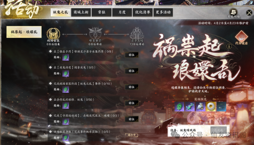 现在可以趁人多(人多参与风云事件很快,甚至跑到打一下就完成了),多刷风云事件,多获取水灵净瓶屯着。后续每日来开一个就行,其他的采草药和抓戾鬼的任务等人少了再来完成即可。