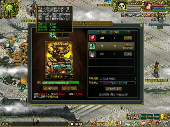 帮派成员们通力合作完成召唤守护神的系列任务,培养守护神,守护神会为整个帮派玩家提供数值加成。神威守护·镇魔:帮派5人组队全民升级时,单人获得的经验奖励提升。神威守护·技巧:帮派5人组队进行帮派活动时,单人获得的经验、道行奖励提升。神威守护·破邪:帮派5人组队全民刷道时,单人获得的道行奖励提升。·5·5·5