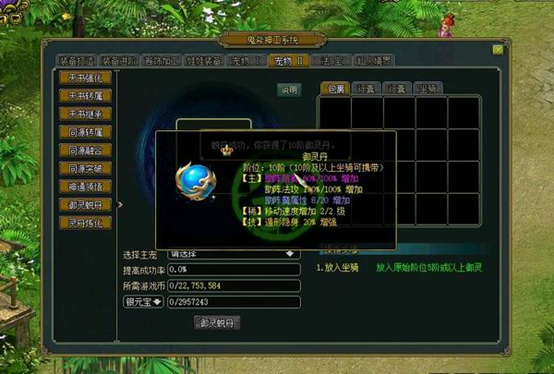 在鬼斧神工中可将御灵进行蜕化,获得同阶位或 1阶位的御灵丹。御灵可装备不高于其阶位的御灵丹,获得御灵属性加成(例如7 1御灵可装备8阶御灵丹),所有御灵都可以佩戴11阶御灵丹。御灵丹属性包括:助阵属性增加、魂兽技能提升,8阶及以上御灵丹可获得稀有属性:移动速度增加、魂兽石空位增加;御灵丹可在鬼斧神工进行炼化,炼化可重新随机属性。 17 18118