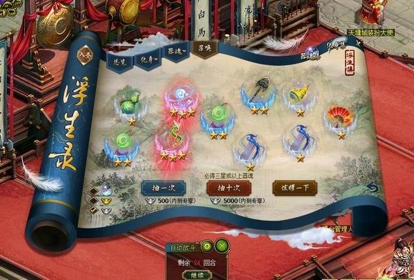开放器魂召唤功能,玩家可在浮生录中召唤器魂,角色加护器魂后可获得属性加成。器魂为浮生化身所用武器之精魂,给对应化身附灵后,可以使该化身的守护晋阶为“真·守护”。真·守护拥有携带护驾宠的能力,真·守护最多允许上阵2名,护驾宠最多允许携带2只;除了原有守护可参与的系统外,真·守护还可参与入圣局、瑶池演武、通天塔、昆仑神镜、帮派日常挑战等诸多系统(打开守护状态栏,左上角帮助图标查看参与系统详细)。22
