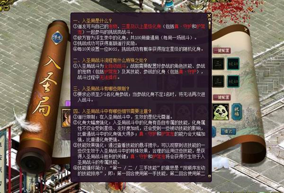 入圣局战斗为全自动战斗,玩家可与自己的宠物、守护和护驾宠一起参与战斗。在入圣局中真·守护和护驾宠会受到大幅强化。挑战过程中,玩家可以选择强大的弈趣增强自己的实力。入圣局取代了仙缘谱系统,仙缘谱会在2025年4月27日关闭,28至30日可领奖。仙缘谱会在2025年4月27日关闭,28至30日可领奖。20254272830