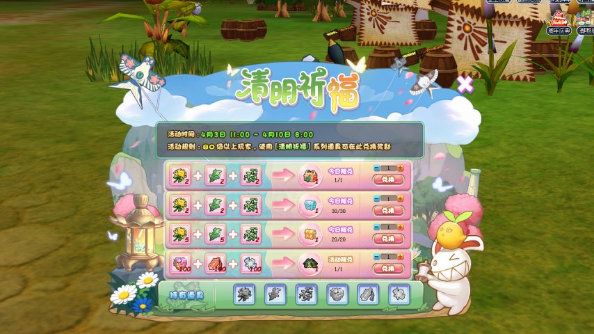 今天《希望OL》游戏更新后,冒险者在游戏中击杀噜啦族即有几率获得菊花、艾草、柳枝等清明活动材料,这些东西可以在活动界面兑换清明祈福礼盒和清明宝箱,打开礼盒和宝箱会获得清明祈福花篮、清明祈福木牌、清明祈福风筝,可以用来兑换清明踏春时装。