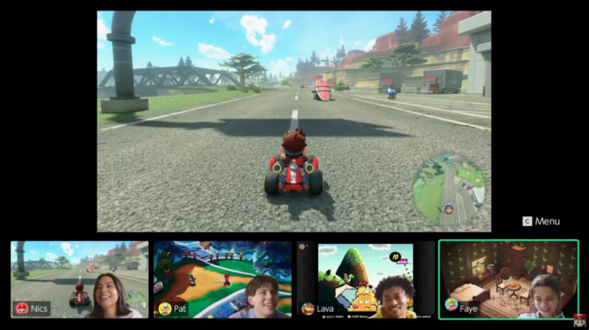 值得一提的是,GameChat功能所关联的,正是手柄新增的“C键”功能。按下按钮,调出会议窗口后,玩家可以借助内置在Joy-Con的麦克风实时语音,甚至能随时同步自己的游戏画面。不过从直面会上展示的效果来看,同步的画面卡顿效果比较明显,或许应用场景会比较有限。