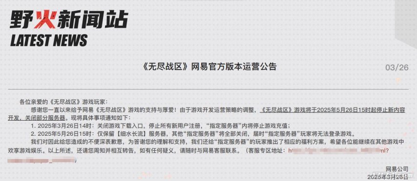 近日网易旗下24工作室开发的《无尽战区》宣布,因为运营策略的调整,游戏将于2025年5月26日关闭大部分的服务器,仅保留“细水长流”服务器。