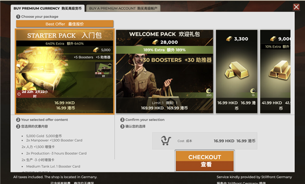 像这个类似钢铁雄心 4 的页游《 战争召唤 》,就有首冲优惠、入门包等我们比较熟悉的氪金项目。
