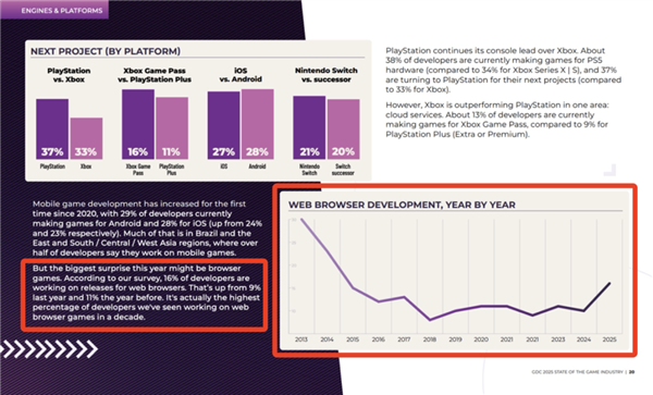 报告的第 20 页左下角的一小段,提到了 16% 的开发者表示他们正在开发网页游戏,这也是近十年来,游戏工作室们对网页游戏最感兴趣的一次。