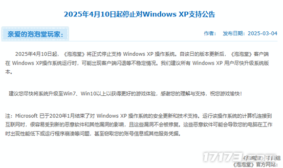 日前,经典休闲游戏《泡泡堂》发布公告,宣布将于2025年4月10日起正式停止支持Windows XP操作系统。日前,经典休闲游戏《泡泡堂》发布公告,宣布将于2025年4月10日起正式停止支持Windows XP操作系统。