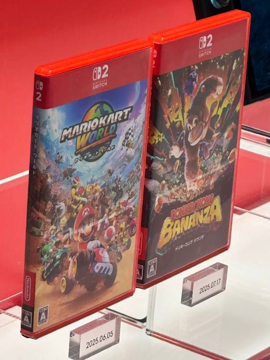 Nintendo Switch 2 的日版游戏卡带盒设计,目前正在京都的任天堂博物馆展出。与之前的透明塑料边框不同,新的卡带盒采用了醒目的红色边框。然而,最引人注目的变化在于盒子的封面设计延伸到了侧边(卡带盒的脊柱部分)。换句话说,玩家们将不再看到只有简单文字的红色侧边。
