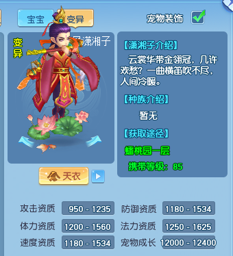 看完了外貌,我们再来关注一下他的资质。潇湘子是85级的法宠,所以有着1625的优秀法力资质;此外,他的体力资质、防御资质和速度资质也都中规中矩,几乎没有哪一项算是短板。