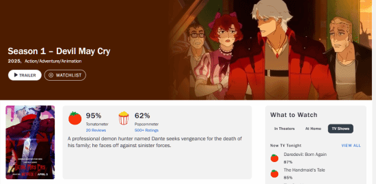 由网飞出品的人气动作游戏系列《鬼泣》同名动画剧集已于4月3日正式开播,截止至发稿时,本片在影评网站烂番茄的新鲜度(影评人评测)高达95%,但爆米花指数(观众评分)仅来到62%。
