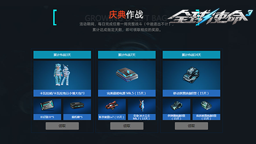 除了签到抽奖,“庆典作战” 环节同样精彩。玩家当日完成任意一局完整战斗,累计达 3/7/14 天,就可前往活动页面领取相应的奖励。这里的奖励同样丰富多样,卡瓦拉熊/卡瓦拉兔以小博大包、斩杀装置 Lv7、变身-冰火公主 Mk.7 等九款奖励,等待玩家们凭借自身的战斗热情和活跃度去解锁,为玩家们在游戏战斗中增添更多乐趣与动力。快穿上10%加血时装,携带着高级装置,身有7级冰火公主,去战场上赢个痛快!