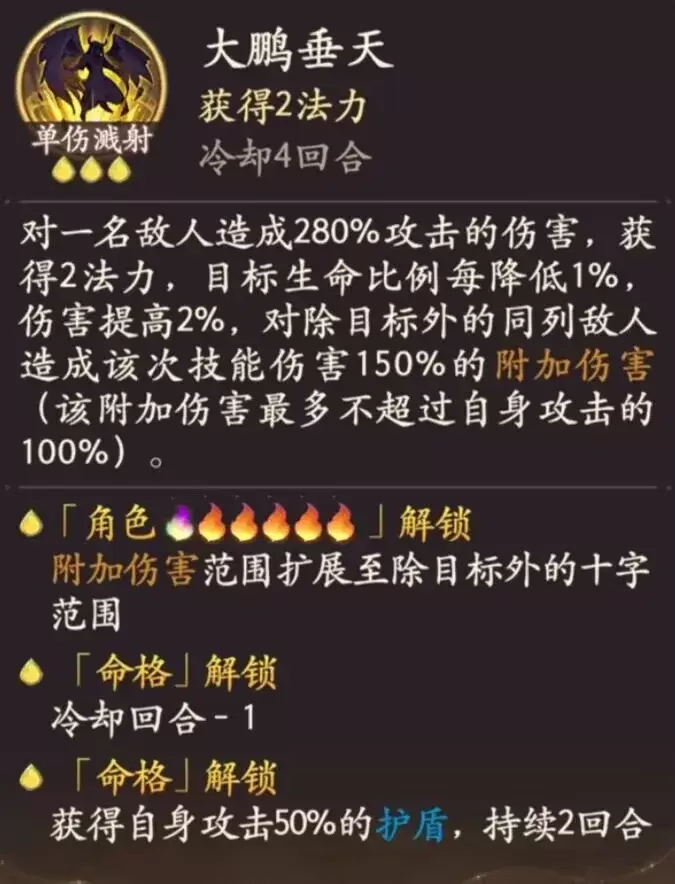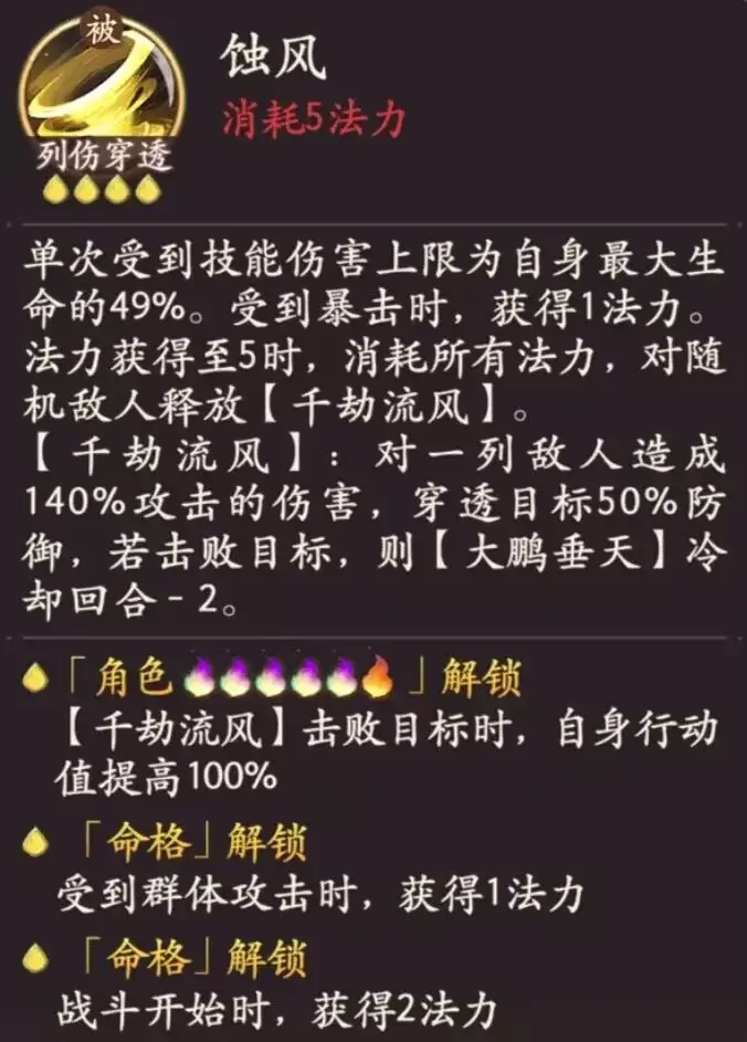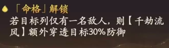 单伤溅射,附加伤害仅计算30%的防御,伤害还是较高的,释放大招获得护盾也提升了自身的生存能力。且【千劫流风】击败目标,可使【大鹏垂天】冷却回合-2,缩短了伤害真空期。单伤溅射,附加伤害仅计算30%的防御,伤害还是较高的,释放大招获得护盾也提升了自身的生存能力。且【千劫流风】击败目标,可使【大鹏垂天】冷却回合-2,缩短了伤害真空期。