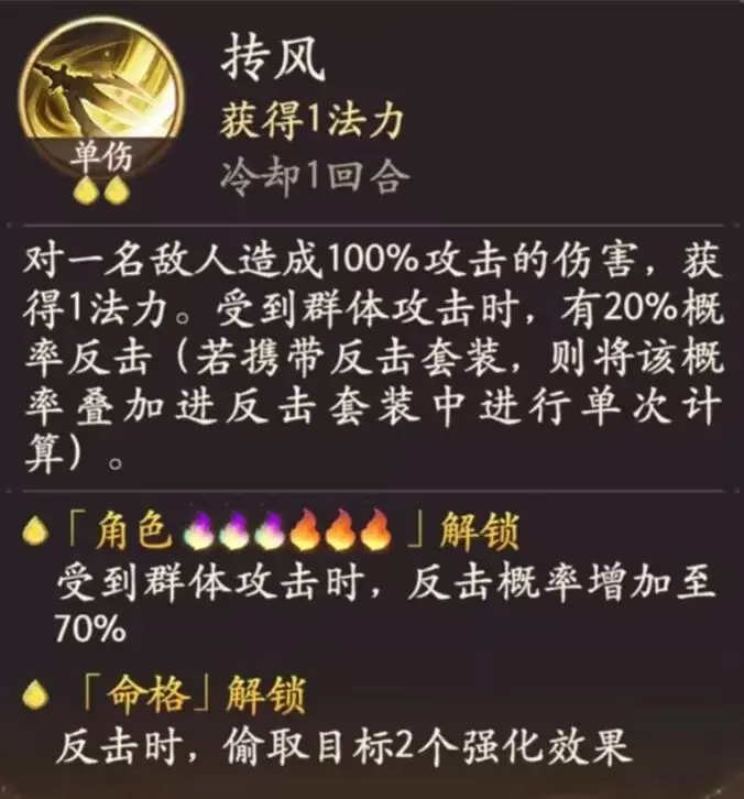 单体伤害技能,受到群体攻击时概率反击且能偷取强化效果。单体伤害技能,受到群体攻击时概率反击且能偷取强化效果。