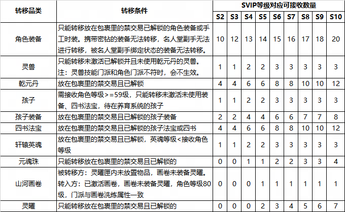 同身份证账号下可作为接收角色的数量有限,其中SVIP2可以有1个角色作为接收方,SVIP6可以有2个,SVIP9可以有3个,成为接收方后,该角色在活动期间无法上架藏宝阁,且不支持任何理由的误操作申请,请各位少侠谨慎操作。