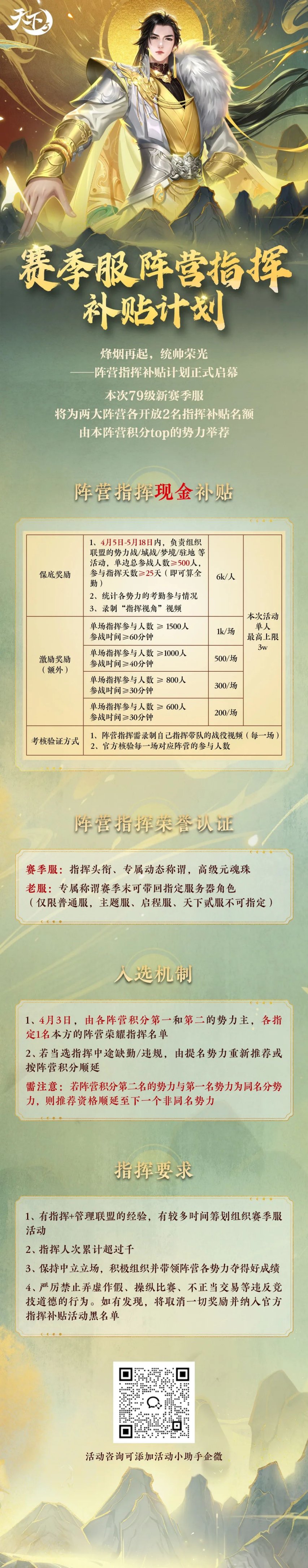 阵营指挥补贴计划现已启幕!入选的指挥只要满足参与指挥天数、录制“指挥视角”相关视频等条件,本次活动单人总计最高可获得30000元现金奖励!想参与的少侠,不妨下滑查看完整长图哟~