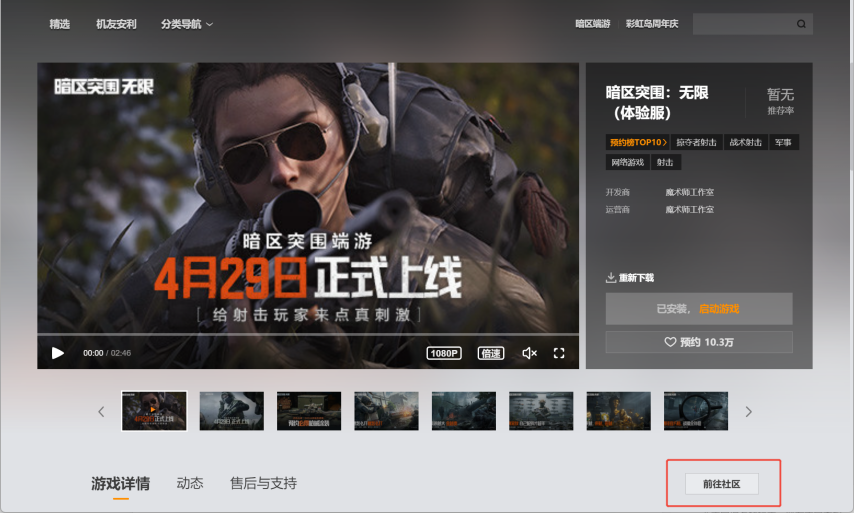 1.点击或搜索进入WeGame《暗区突围:无限(体验服)》产品专区页,在页面右下角点击【前往社区】(如图红框所示)