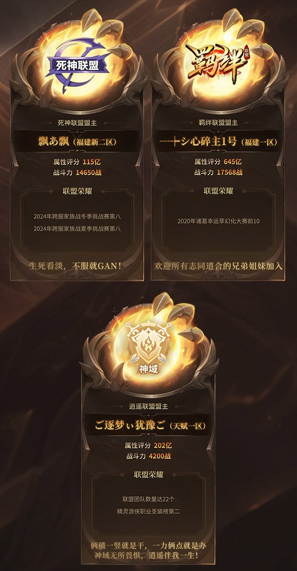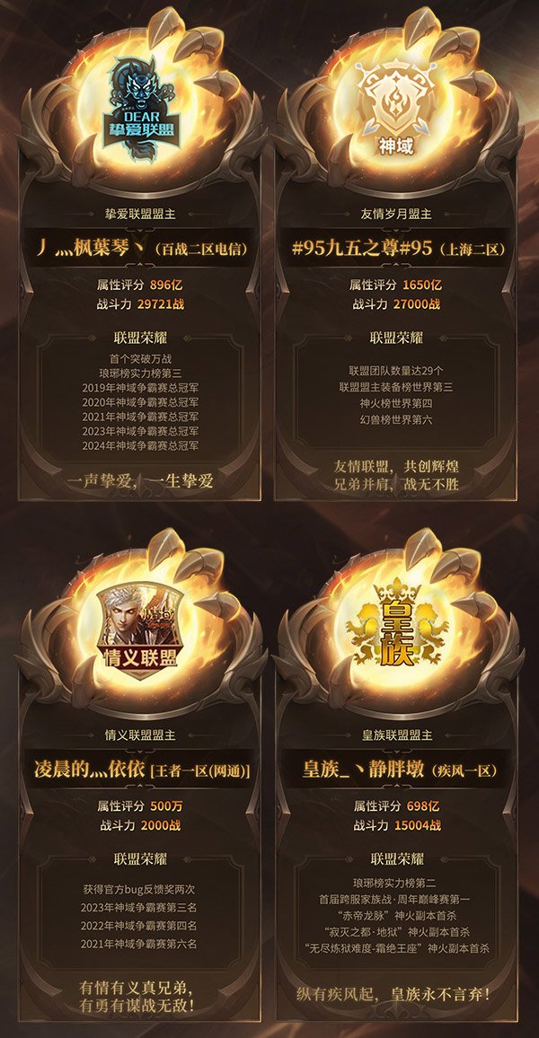 神域争霸赛堪称《魔域》最具含金量的"全明星战役",每个联盟的名字背后都承载着震颤服务器的赫赫威名。卫冕冠军"挚爱联盟"在盟主"丿 灬枫葉琴"率领下剑指连冠,没有人比他们更熟悉身处巅峰的自信;而上届比赛离冠军只有一步之遥的“皇朝联盟”如今也已登顶琅琊榜实力榜,联盟主“皇族_丶苛苡”自然不会放过这个成就新王加冕传奇的机会;“皇族”家族的另一名成员“皇族_丶静胖墩”也将率领“皇族联盟”参与角逐,琅琊榜实力榜第二名的含金量同样不容小觑;而在24年跨服战中横扫六合的"开心联盟"、联盟盟主装备榜世界第三的“友情岁月”、以及逍遥、情义、羁绊、死神等诸多老牌联盟同样拥有搅动风云的能力。纵观豪华的参赛联盟名单,每个联盟都具备问鼎实力,胜负或许只在毫厘之间!