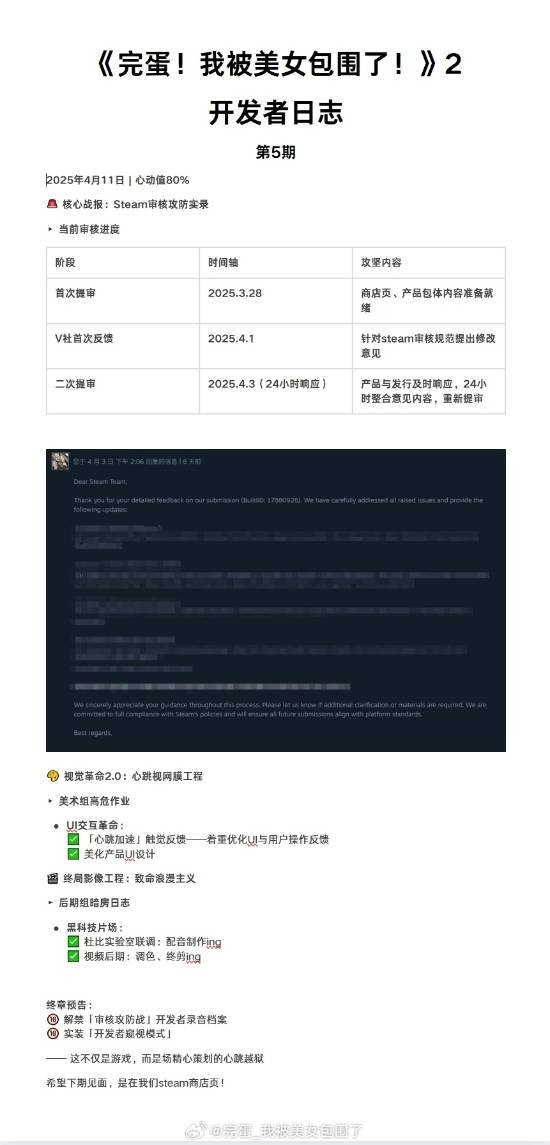 根据本次开发者日志显示,《完蛋!2》的Steam审核过程正在稳步推进。游戏于3月29日首次提交审核并顺利通过,产生了版本信息。4月1日,开发团队收到了来自Valve的首次反馈,针对审核提出了一些修改意见。