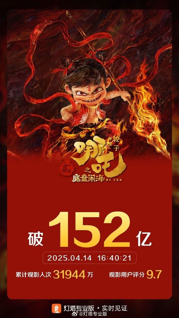 据灯塔专业版实时数据,截至4月14日16时40分,影片《哪吒之魔童闹海》票房突破152亿。