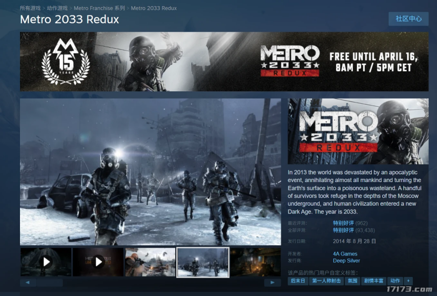 4 月 15 日消息,为庆祝《地铁》系列游戏 15 周年,Steam、GOG、Xbox商店现可免费领取原价98元的《地铁2033 Redux》(Metro 2033 Redux),领取截止时间至4月16日23点。