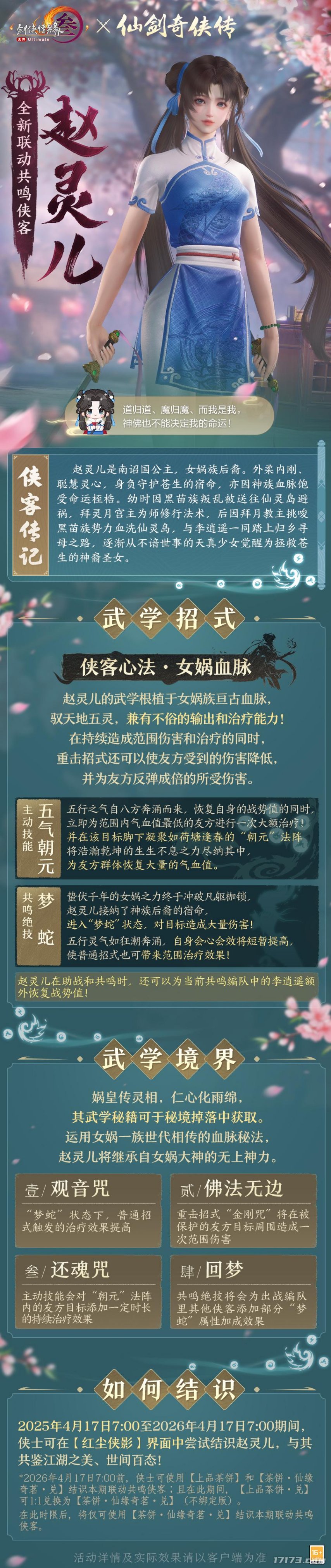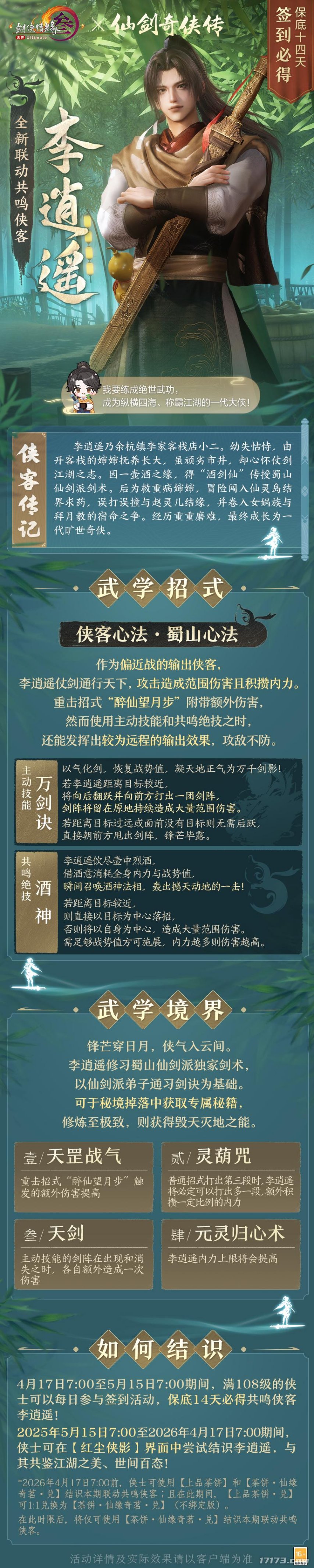 《剑网3》新资料片“太极秘录”定档4月17日。届时,《仙剑奇侠传一》联动即将同步上线。今日,游戏官方带来了全新共鸣侠客李逍遥和赵灵儿情报!据悉,签到14天将保底送共鸣侠客李逍遥。