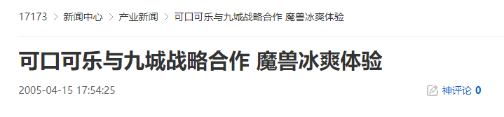 中国上海,2005年4月15日,可口可乐(中国)饮料有限公司与网络游戏开发商及运营商第九城市计算机技术咨询(上海)有限公司(下称“第九城市”)今天在上海正式宣布双方建立战略合作伙伴关系。双方在会上联合启动了“可口可乐-要爽由自己 冰火暴风城”的活动。此次活动作为双方携手合作的第一攻势,将为年轻时尚的消费者带来全新的网络“冰爽”体验。这是国际最大的饮料企业与国内领先的网络游戏开发商及运营商首次全方位市场对接,双方将发挥资源整合、强强联手的优势,在品牌、市场、渠道等方面展开多层次合作。 中国上海,2005年4月15日,可口可乐(中国)饮料有限公司与网络游戏开发商及运营商第九城市计算机技术咨询(上海)有限公司(下称“第九城市”)今天在上海正式宣布双方建立战略合作伙伴关系。双方在会上联合启动了“可口可乐-要爽由自己 冰火暴风城”的活动。此次活动作为双方携手合作的第一攻势,将为年轻时尚的消费者带来全新的网络“冰爽”体验。这是国际最大的饮料企业与国内领先的网络游戏开发商及运营商首次全方位市场对接,双方将发挥资源整合、强强联手的优势,在品牌、市场、渠道等方面展开多层次合作。