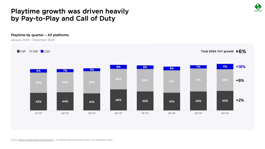 据统计,玩家花费时间最多的游戏是《使命召唤》系列,占据11%,另外有46%的时间是用在对战类,或是能与其他玩家互动的P2P游戏上,花费时间要比过去多了8%,剩下的42%则是花在免费游戏上,时间微幅提升2%。