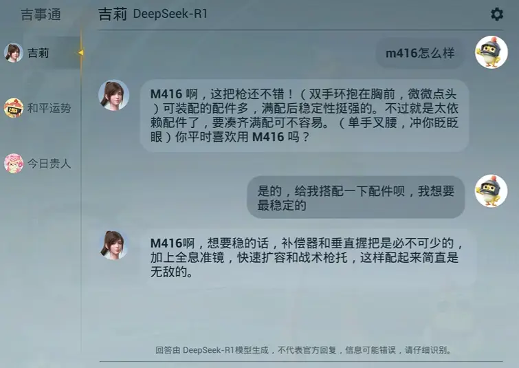 《和平精英》做的事简单来说就是,把DeepSeek接入游戏的数字代言人“吉莉”身上,玩家通过大厅的“吉事通”入口,来与AI对话。这个对话内容,可以是聊天打屁,也可以是攻略查询、游戏百科。