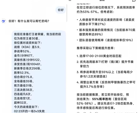 方法也很简单,只要将自己账号的段位、KDA、参团率等数据如实报给Deepseek,Deepseek就会根据提供的资料再结合大数据进行分析,并给出最佳解决方案。DeepseekDeepseek