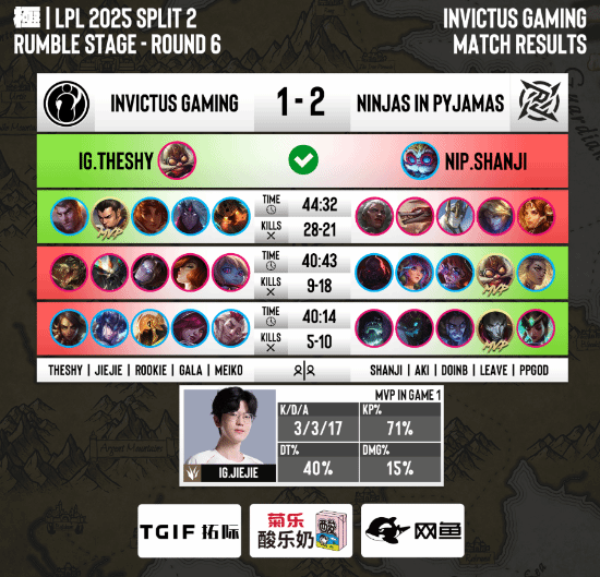在昨晚进行的《英雄联盟》LPL第二赛段组内赛中,IG战队以1:2的比分输给了NIP战队,目前IG战队以3胜3负的成绩排在“登峰组”第四的位置。