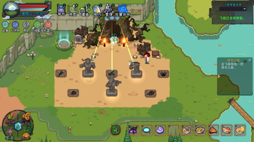 为了能够在这片岛屿生存下去,你需要在野外采集野果或种田来维持温饱,还要采集各种矿产资源用于工具零件的生产加工。但你也不必事事亲为,从矿物采集、农田耕种到各种零件生产的搬运再分配都可以交由机器人来实现,而你只需要规划好资源的生产比例,保证整个生产能够有序地进行。