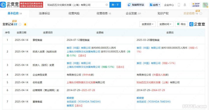 近日,根据企查查APP的最新信息显示,上海东方明珠索乐文化发展有限公司发生了重大的工商变更。公司名称正式变更为“玩站匹五文化娱乐发展(上海)有限公司”,同时原股东上海东方明珠文化发展有限公司退出持股,现由索尼(中国)有限公司实现全资控股。