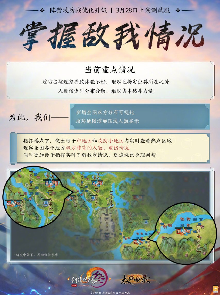随着攻防Roguelike和动态战场的出现,影响战局胜负走势的,也许不再是双方人数对冲了,新增了可视化和人数区域显示系统,一方面降低了攻防指挥的上手难度,另一方面则会提高指挥对战局的把控能力,简单来说,现在攻防给人的感受就是打法单一,近点拉远点,拼的是双方谁能先到战点站住脚,弱势方或者散人比较多的阵营,反扑的难度和成功概率极低。改动之后,指挥可以根据地图显示分配,调控兵力,散人则可以快速跟上大团,甚至能提前判断进攻目标,大大增加了参与感。Roguelike