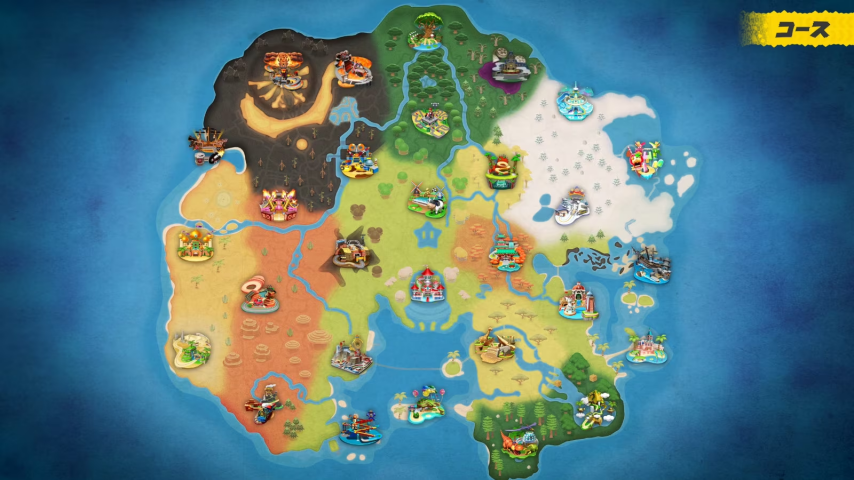 本次在赛道上有着各式各样的风格,也包括了一些怀旧赛道,光看地图中分布的点,加上每个点与点之间都由赛道连接,不难猜出本次赛道的数量相当惊人。在一般的大奖赛模式下,每个主题将由4个连续的赛道关卡来竞技。4