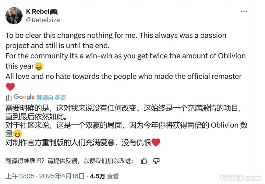 许多玩家觉得,这对他们来说一定糟透了,毕竟13年的心血制作似乎白费了,不过民间重置项目负责人Rebelzize表示他对此十分满意,因为对于喜欢这个系列的玩家来说,今年可以玩到两份《上古卷轴4:湮没》重置版了。