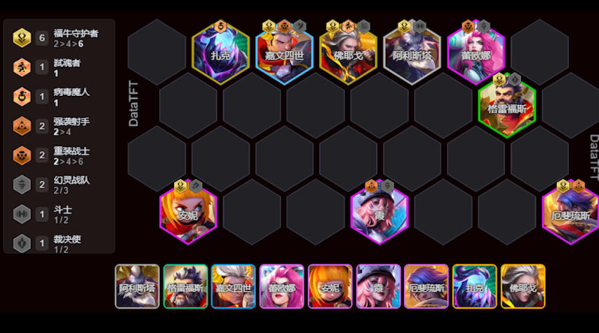 特别是佛爷我觉得体系内,佛爷给点肉装比给纯输出要好的,因为他是特别重要的输出位不能暴毙,我这局会这么强,特别是一星扎克和雷欧娜的时候那么强,主要就在于羁绊给我补了坦度,再理解一遍坦度比那些5费两星要重要的多,这个阵容你可以忘掉所有的95,你就一门心思把福牛的层数叠起来,厄斐琉斯,安妮佛耶戈3C就可以,9人口很多情况下都是雷欧娜加上扎克双坦最好,霞,莎弥拉,螃蟹谁愿意两星谁就上,注意这个防佛耶戈暴毙站位,主坦克三件装备一定要是顶对面主C,因为佛耶戈会直接往人群里面冲,那你要是给个牛头给对面的主c位,牛头秒死下一个秒死的就是佛耶戈,阵容强度直接就少一半